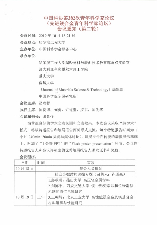 中国科协第382次青年科学家论坛(先进镁合金青年科学家论坛)会议通知(第二轮)